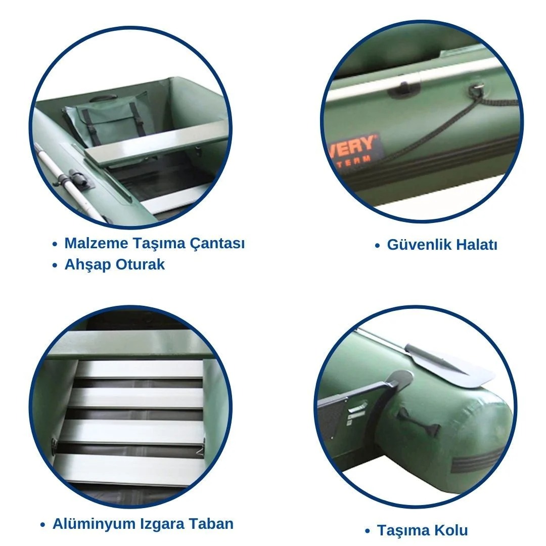 Ayarlanabilir kürek aparatı, Ahşap oturak, Alüminyum ızgara taban, Suya dayanıklı PVC kaplama kıç tahtası, Su tahliye tapası, Sürtünmelere karşı ekstra dirençli yan bantlar, İki yanında güvenlik halatı, Çekme halatı, İç tarafta taşıma kolu, Burun tarafında cırtlı bantlı malzeme çantası.
